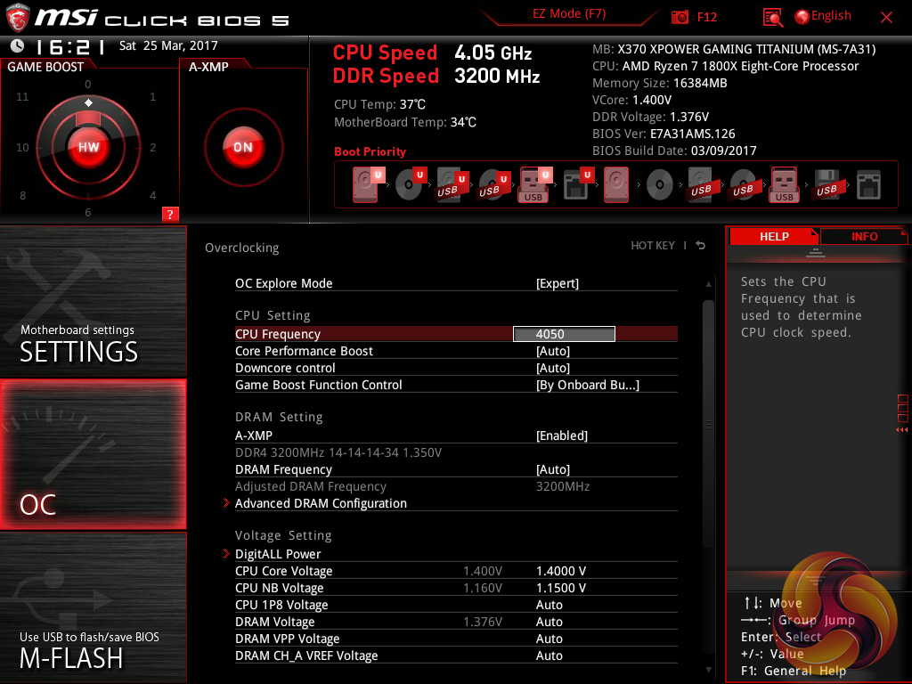 To test the MSI X370 XPower Gaming Titanium motherboard’s CPU overclocking potential, we aim to set the CPU voltage close to 1.40V. CPU VCore is set to 1.40V, NB voltage is set to 1.15V, and we applied the Mode 4 LLC setting.