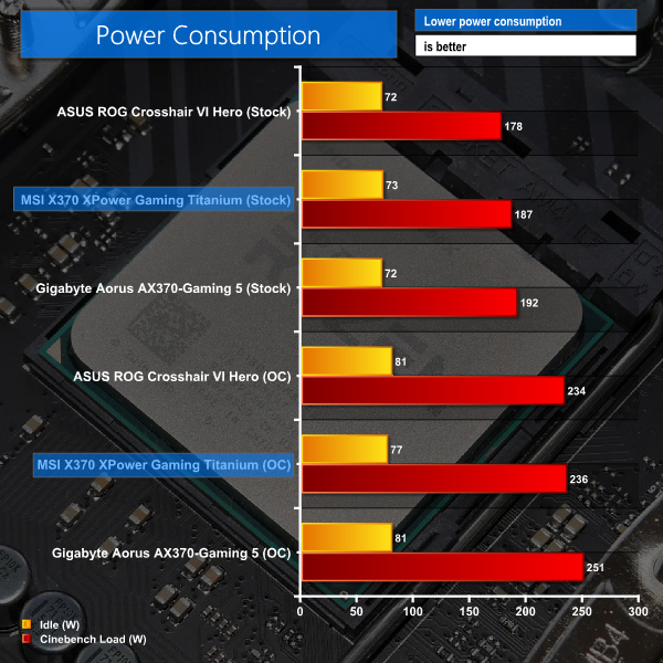 Power consumption from the MSI board sits somewhere between ASUS' and Gigabyte's. 187W system-wide power draw is seen under stock-clocked load with the 1800X. This increases to 236W when overclocked, which is practically the same as the power draw level from ASUS' ROG Crosshair VI Hero.