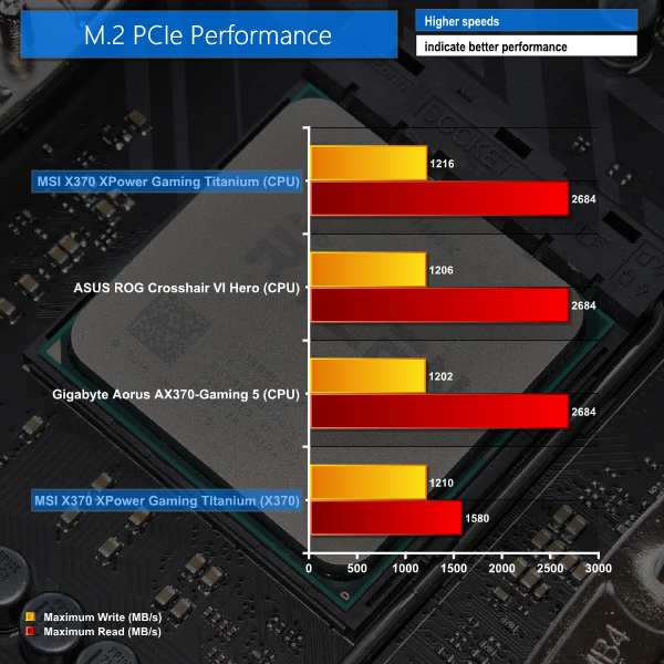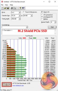 M.2 PCIe performance was slightly faster on MSI's board than on the competitors. The write speed is improved by a small amount over the competitors and this result is repeatable. MSI's M.2 Shield may be having an influence here, as it managed to keep our Toshiba OCZ RD400 SSD at a maximum of 69°C during the ATTO test, which is a few degrees cooler than on ASUS and Gigabyte competitors (and beyond margin of error).
