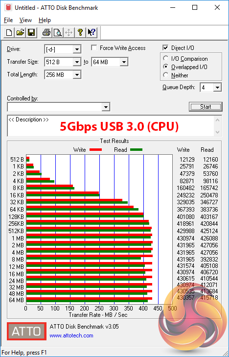 USB 3.0 5Gbps performance tops out at close to 450MBps, as we would expect. This was using the CPU-fed ports.