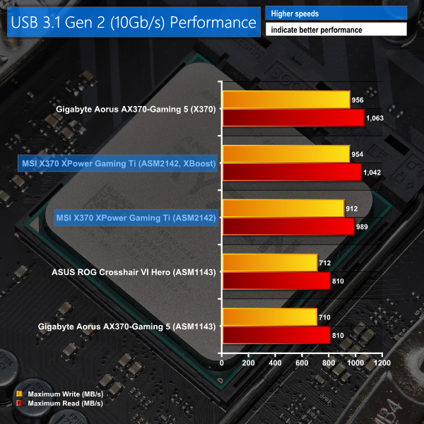 ASMedia's newer ASM2142 USB 3.1 Gen 2 controller used by MSI puts the ASM1143 opted for by Gigabyte and ASUS to shame. Without any software optimisation, MSI's solution is more than 20% faster than the chipset opted for by the two charted competitors. It is, however, slower than the 10Gbps USB 3.1 Gen 2 ports natively offered by the X370 chipset. Excellent job, AMD.
