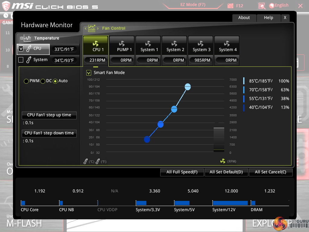 Hardware Monitor is where the primary fan control actions take place. PWM and DC control modes are selectable. MSI keeps in-built fan speed presets to a bare minimum and instead relies on its good graphical control method.