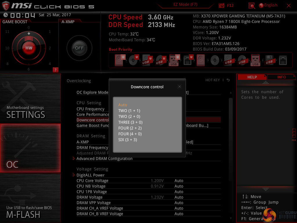 The ability to run fans at 0% up to a user-defined temperature level is a strength for MSI and speed hysteresis control is good to have. However, the fact that only CPU and System temperature sensor data can be read is disappointing. ASUS, with its ROG Crosshair VI Hero, and Gigabyte's Aorus AX370-Gaming 5 provide more control in this aspect.