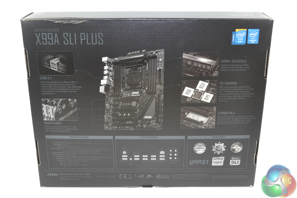 MSI ships the X99A SLI Plus in plain black packaging that features a decent amount of product information on the rear side.