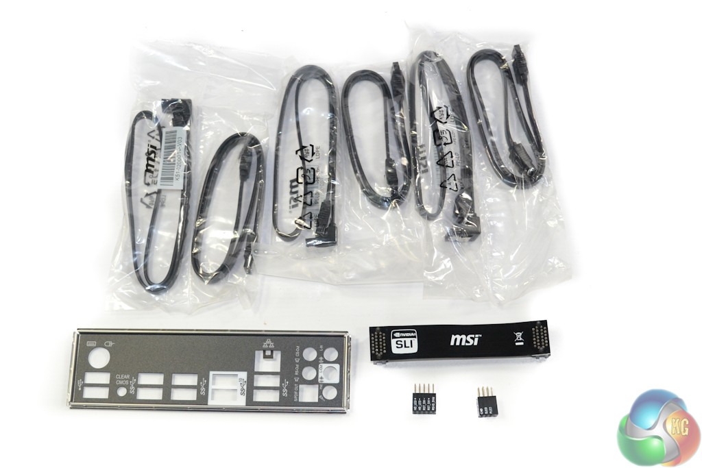 The solid bundle includes a rear IO shield, convenient M-connector blocks, a black flexible SLI ribbon, and six SATA cables.