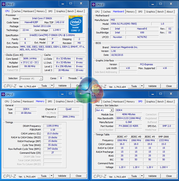 We applied the OC Genie button through the board's UEFI. OC Genie boosted our 5960X CPU to 3.7GHz on all cores under load, but memory frequency was reduced to 2400MHz. Cache frequency was not changed.