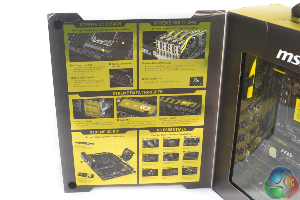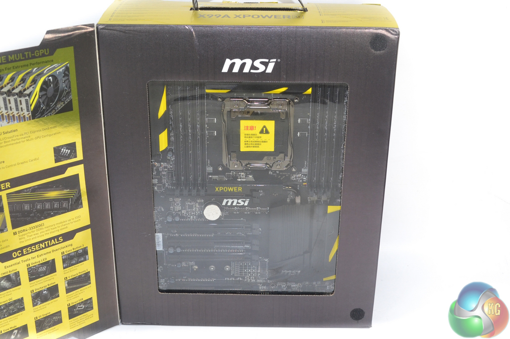 The MSI X99A XPOWER AC ships in typical packaging for MSI OC series motherboards. A yellowy-gold ‘X' is found on the front side, while features and specifications are outlined on the rear.