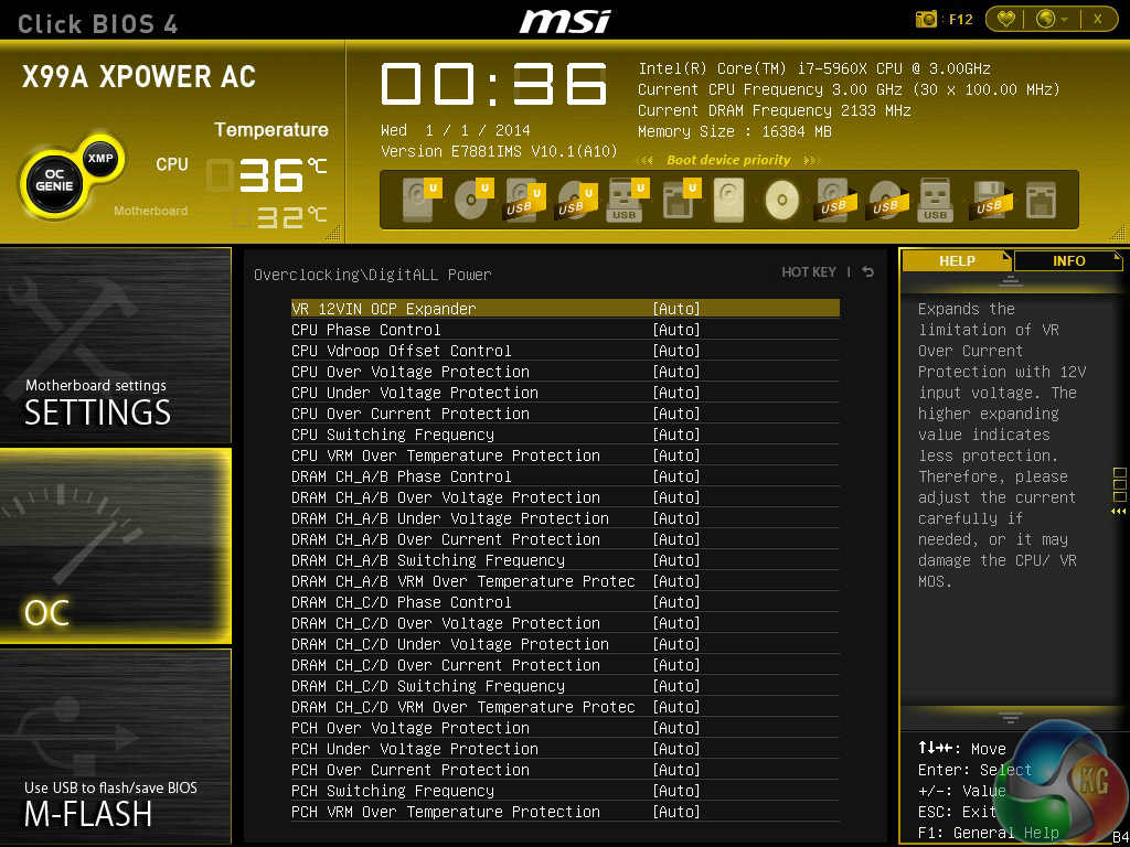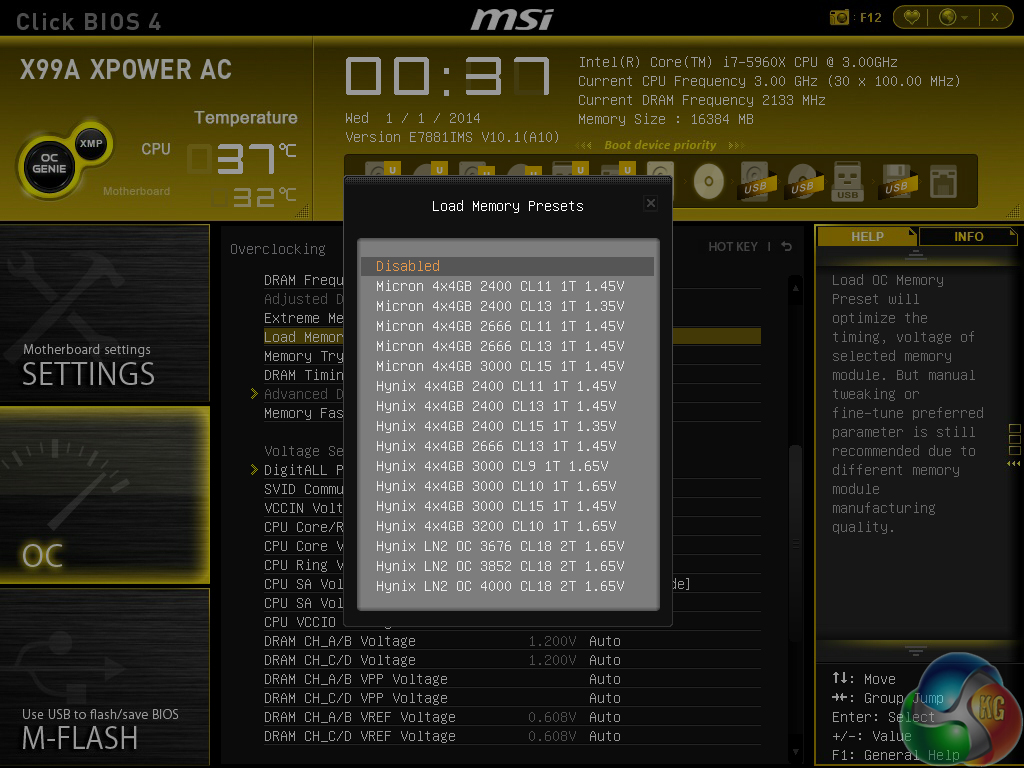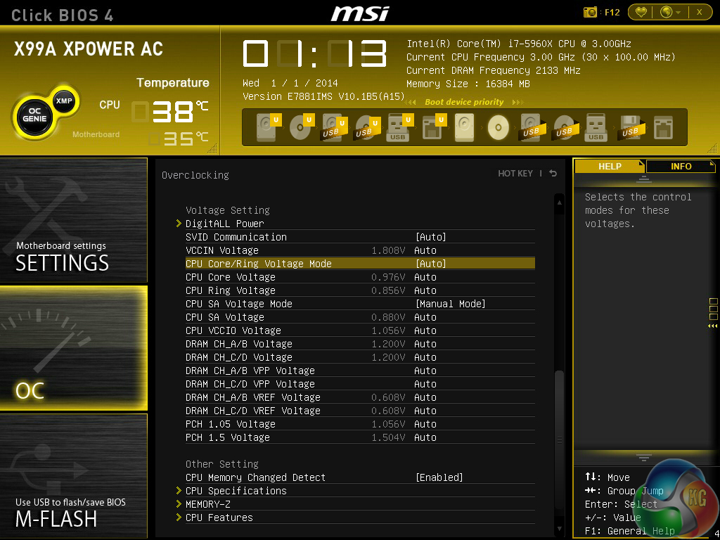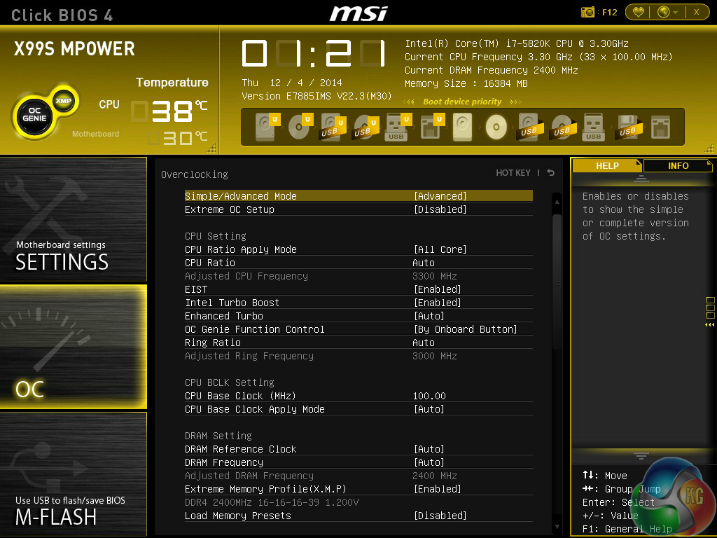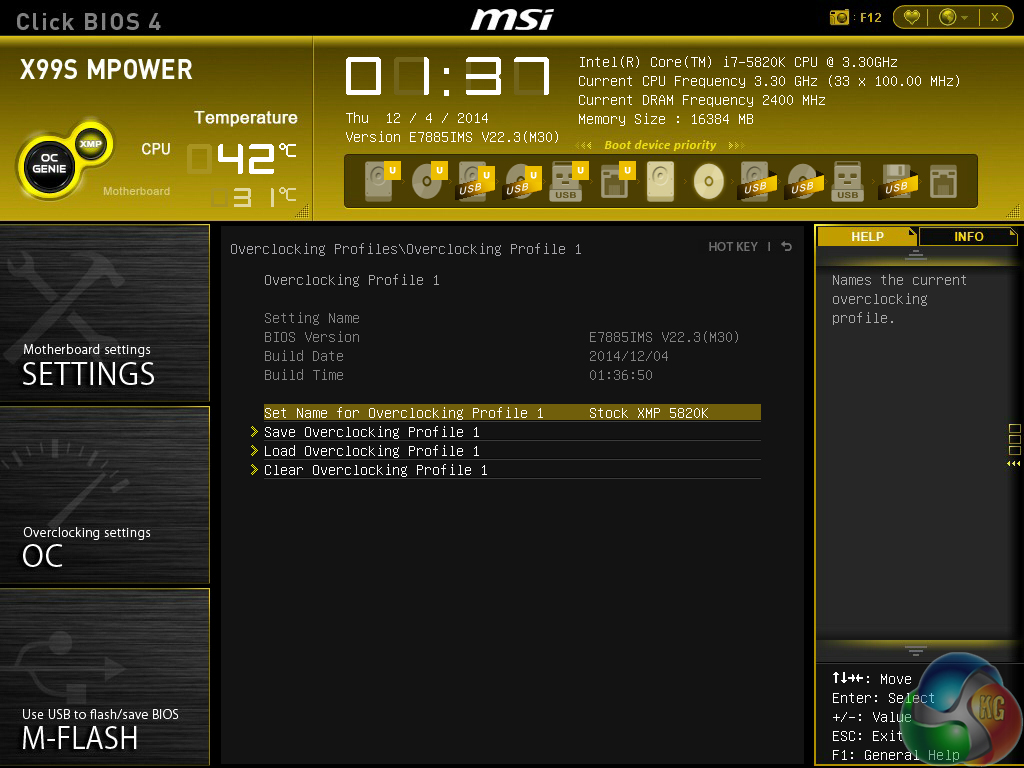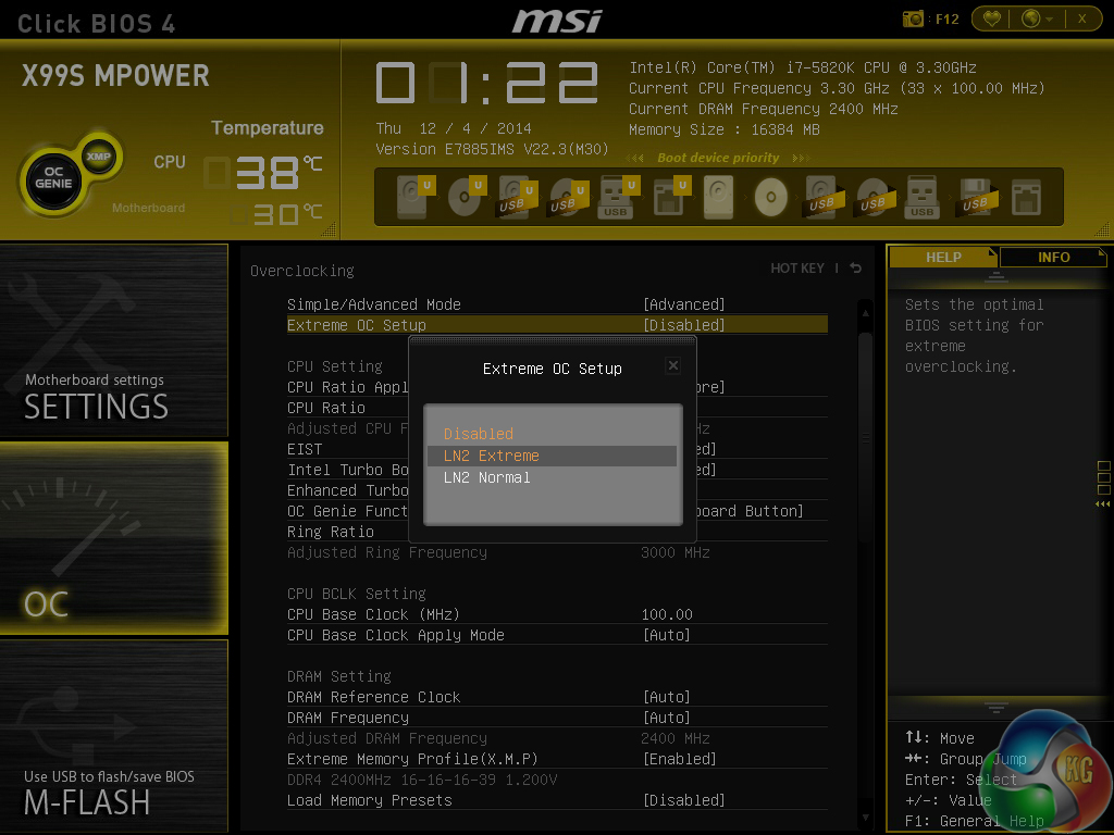 MSI’s Click BIOS 4 interface has a strong underlying ease-of-use aspect. Practising overclockers are given additional information and assistance as they learn about specific settings, but there are also plenty of options for more advanced frequency tuning. The LN2 modes are useful for stripping away unneeded features while pushing for maximum clock speed.