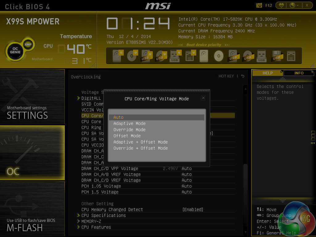 Particularly relevant for the overclocking-geared HEDT platform are the UEFI's power and voltage options. We are happy with the voltage adjustment options that MSI provides – they are going to be sufficient for pushing a chip when using ‘normal' 24/7 cooling, and provide enhanced options for use with extreme cooling.
