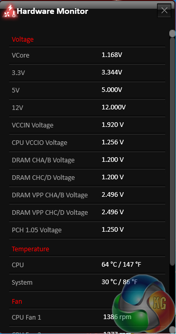 While all CPU cores operate at 3.56GHz with a maximum VCore of 1.168V under load, the CPU drops to 1.53GHz with 0.6-ish volts when idling. We recommend trusting MSI's Command Center readings over those displayed by CPU-Z or HWMonitor. We have tested Command Center‘s accuracy in the past and found it to be very close to readings from a multimeter.