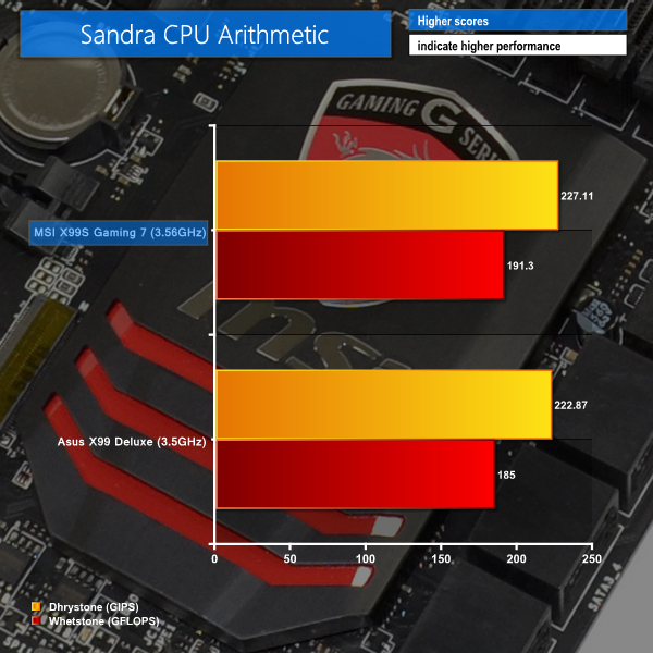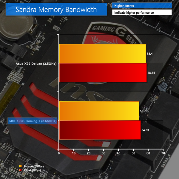 Unsurprisingly, Sandra's memory bandwidth test shows that MSI's X99S Gaming 7 and its 2800MHz CL16 memory cannot compete with Asus' X99 Deluxe and the 3000MHz CL15 RAM that accompanied it.