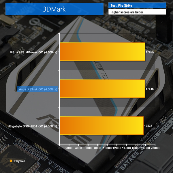 Positive CPU- and system-related performance is continuing through to the overclocked tests. MSI's X99S MPower manages to (marginally) outperform the Asus and Gigabyte competitors in Cinebench and 3DMark physics tests.