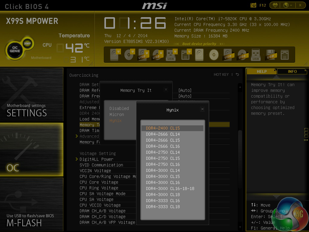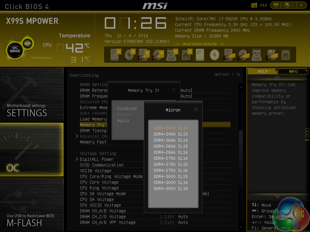 In addition to adjustable system voltage and power parameters are dedicated memory sections. Memory Try It! allows users to apply tweaked overclocking settings to their Hynix- or Micron-based memory kits.