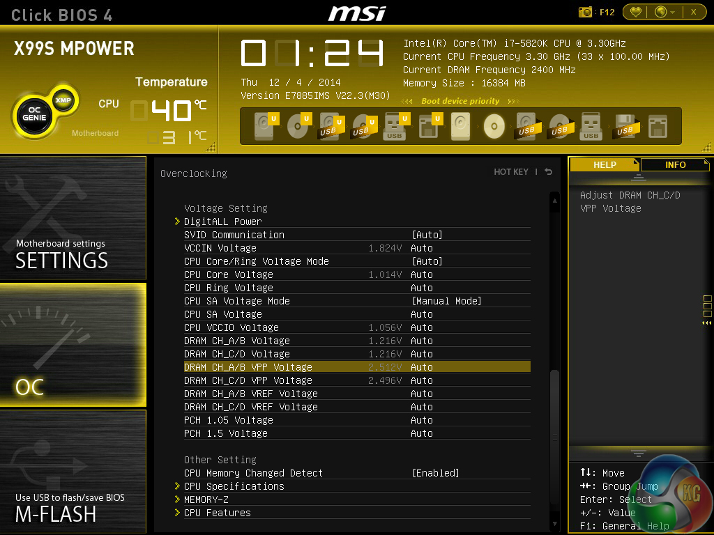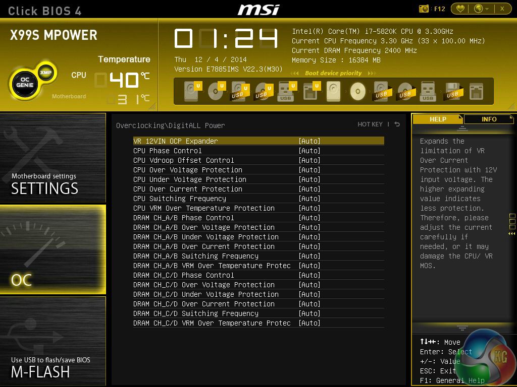 Particularly relevant for the overclocking-geared HEDT platform are the UEFI's power and voltage options. We are happy with the voltage adjustment options that MSI provides – they are going to be sufficient for pushing a chip when using ‘normal' 24/7 cooling, and provide enhanced options for use with extreme cooling.