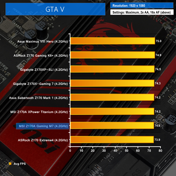 Gaming performance from the MSI Z170A Gaming M7 is solid. Performance differentials between competing motherboards are all within the margin of error of our tests.