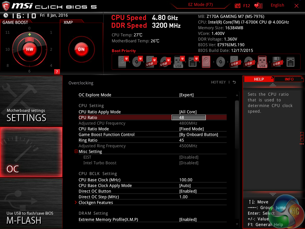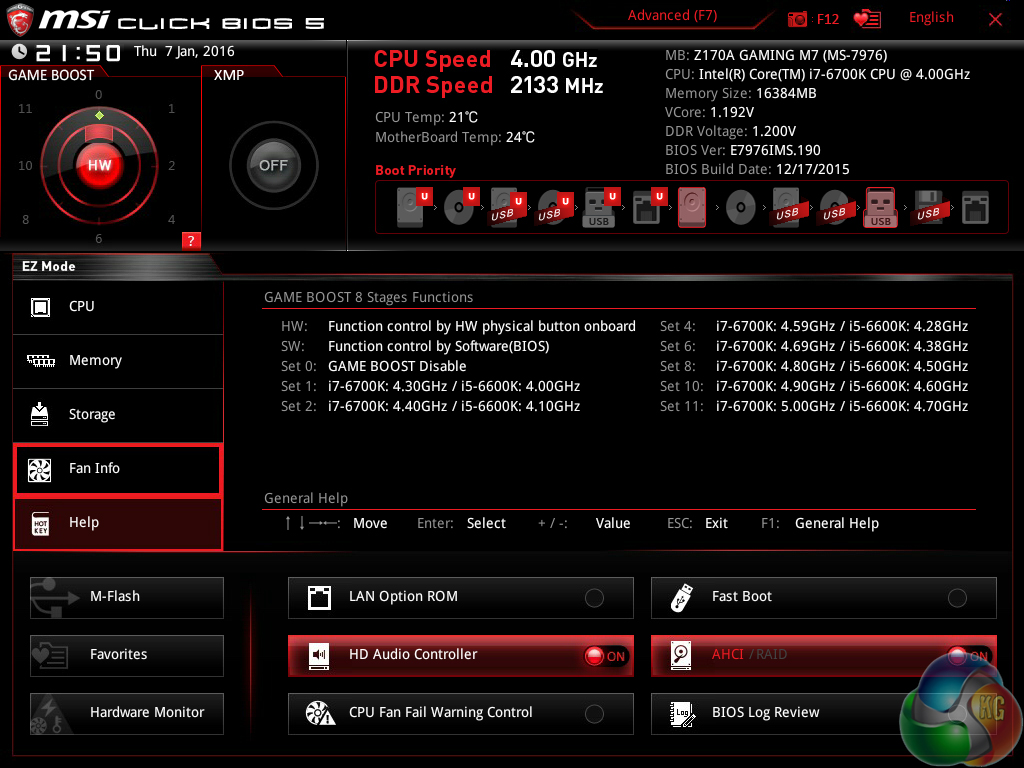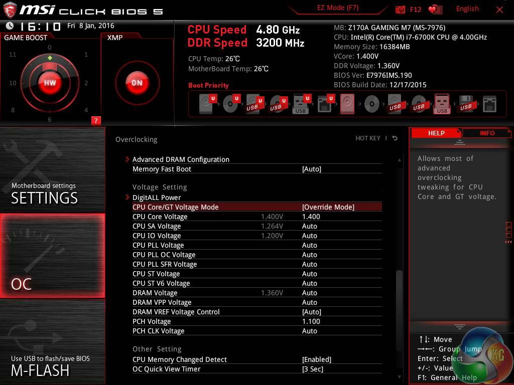 It seems that MSI has applied the ‘manually compensate for it' logic for their overclocking presets; the Z170A Gaming M7 sees a UEFI-set 1.352V for the 4.69GHz preset, whereas the Z170A XPower Gaming Titanium Edition set 1.315V for the exact same frequency preset.