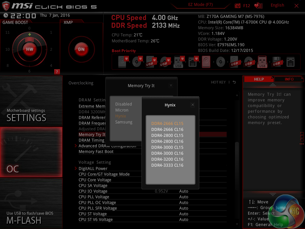 Memory profiles presets are also supplied by MSI, with a number of configurations provided for use with Hynix, Samsung, and Micron DDR4.