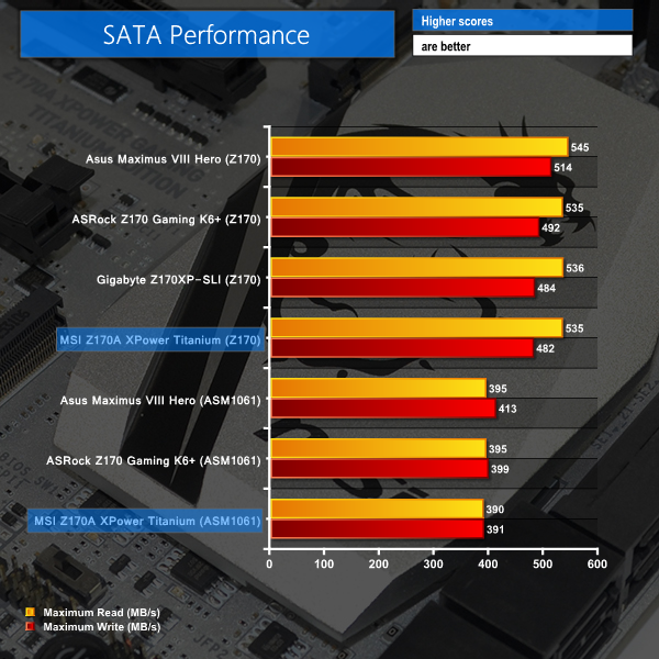 SATA performance from the Z170 ports on MSI's board show no cause for concern. SSD degradation between runs is primarily accountable for small differences in recorded transfer rates on the boards.