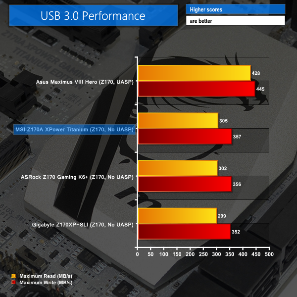 MSI does not provide a UASP-activating software tool for Windows 7 users so the USB 3.0 transfer rates sit well below a 400MBps level.