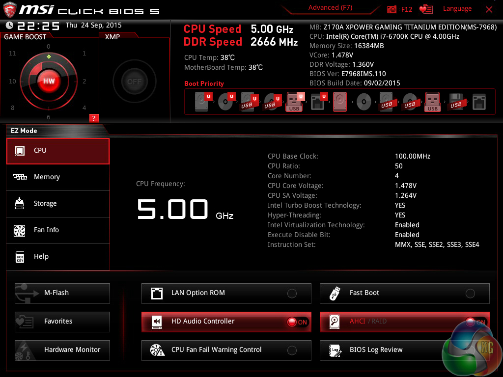 To test the MSI Z170A XPower Gaming Titanium Edition motherboard’s CPU overclocking potential, we first increased the CPU VCore to 1.36V and set the PCH voltage to 1.10V. Our testing allowed a 100% (enthusiast) VDroop setting to be applied by reducing the BIOS-set voltage in comparison to our VCore target. The cache ratio was set to 45x.