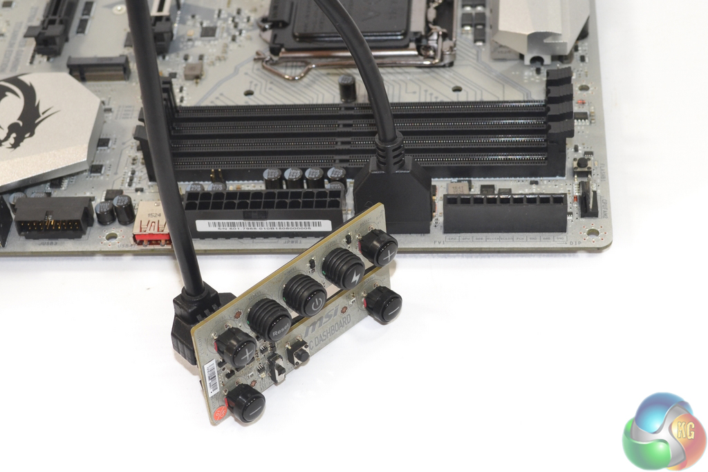 MSI's OC Dashboard is able to sit directly on the motherboard or it can be positioned elsewhere thanks to the included cable. That latter point is useful for sub-zero overclockers because the memory slots regularly freeze during an extended session of even CPU-only LN2 benching.
