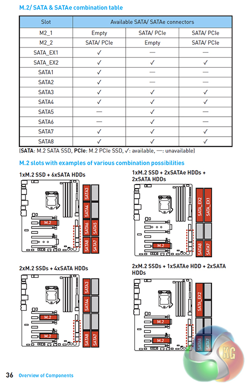 The M.2 connectors also support SATA 6Gbps and older PCIe 2.0 x2 SSDs using the M.2 form factor. RAID 0 and 1 are supported for the M.2 ports and a bootable volume can be created thanks to Intel's latest RST iteration with the Z170 chipset.