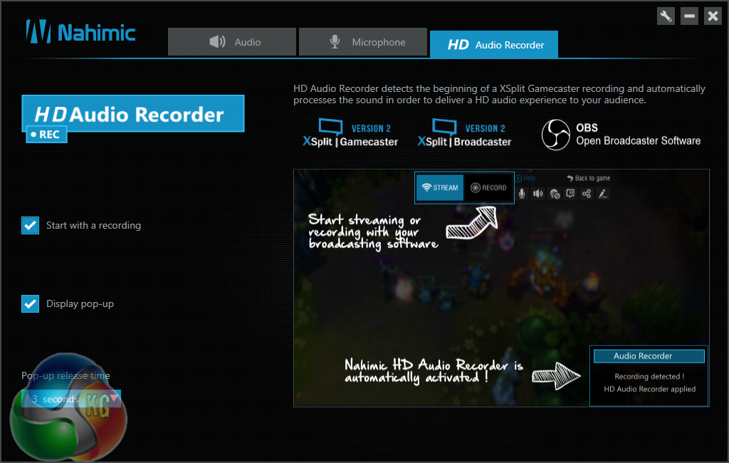 The Nahimic software tool allows specific audio presets to be set and adjusted based on user preference. One of the options is for a HD audio recorded which can be used alongside streaming applications such as XSplit offerings and OBS.