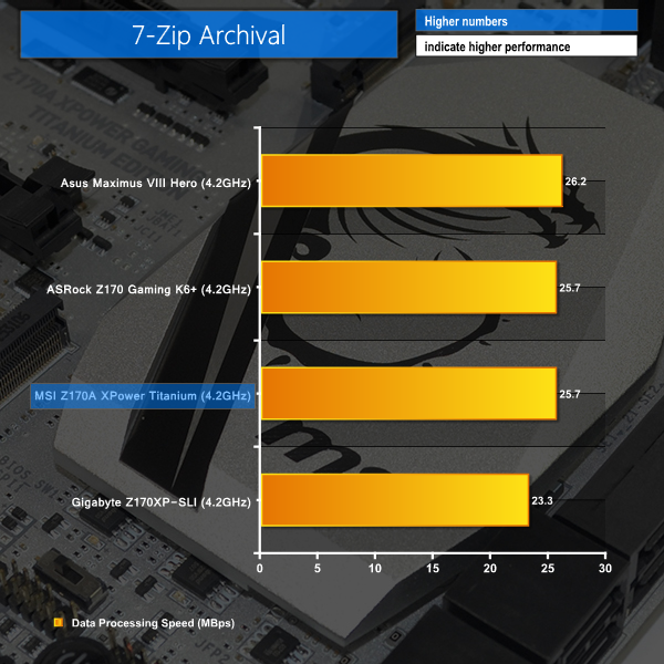 Archival performance through 7-Zip is on par with an ASRock competitor and is one second behind Asus' part.