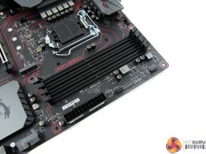 16GB DDR4 DIMMs can be installed, making this motherboard useable with up to 64GB of memory. I like MSI’s on-PCB text that outlines which DIMM slots should be used first for those with two-stick kits.