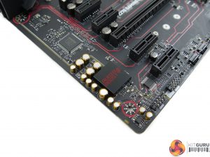 Six right-angled SATA 6Gbps ports are all provided by way of the Z270 chipset. Sat next to those ports is one of the board’s two internal USB 3.0 5Gbps headers for connection to a case. Its right-angled orientation is ideal for users trying to hide the fat USB 3.0 header cable when trying to conduct cable management.