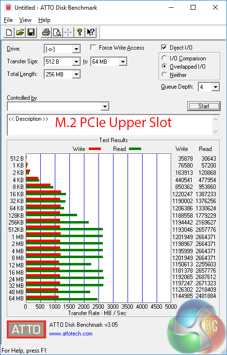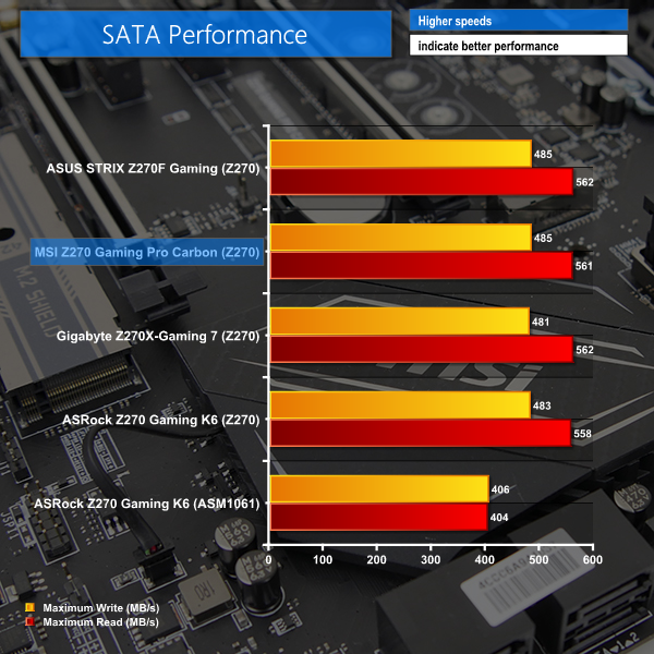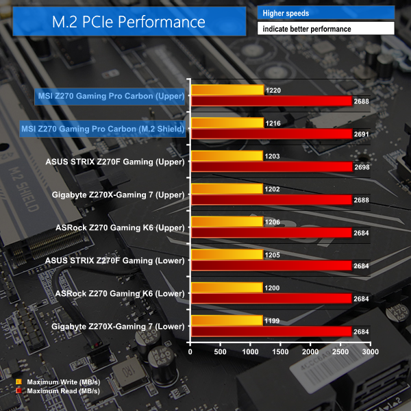 PCIe NVMe performance from both of the MSI Z270 Gaming Pro Carbon's M.2 slots is without bottlenecks. The upper slot can show tendencies for thermal throttling on the SSD. A heavy, sustained write operation will likely force a hot SSD such as the Samsung 950 Pro to thermal throttle and lose performance.