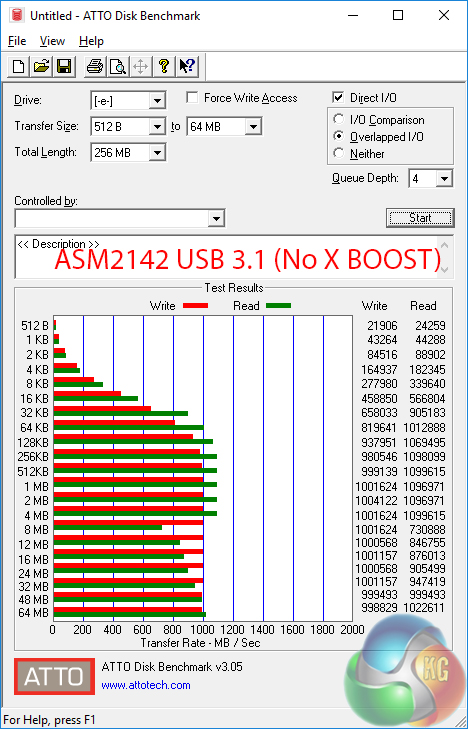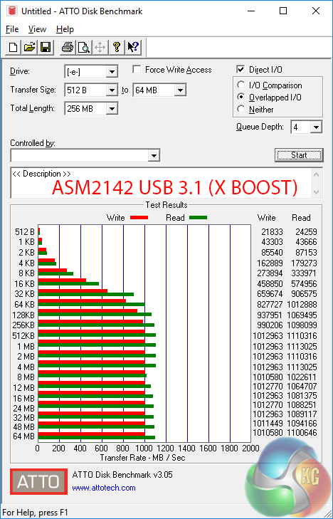 USB 3.1 Gen 2 performance is strong thanks to the use of ASMedia's new ASM2142 chipset. X BOOST software does little to improve transfer rates on our test equipment though it does help to improve the consistency of the sequential speeds, as show by the ATTO charts. This is using the Windows 10 OS.