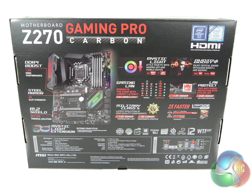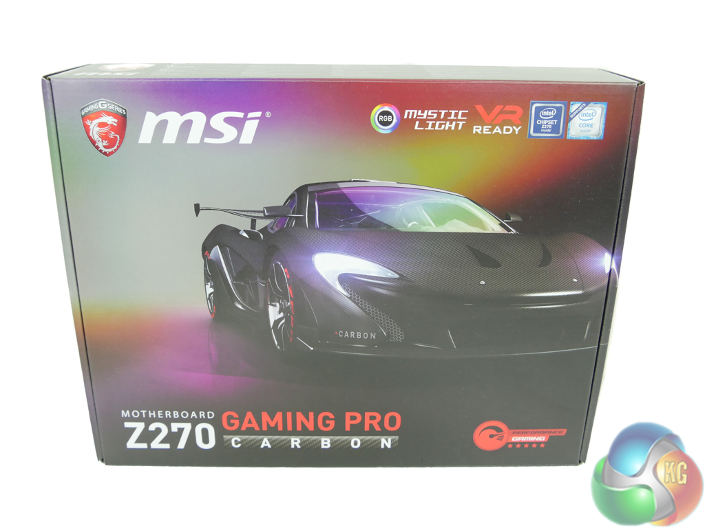 The box for the MSI Z270 Gaming Pro Carbon is shiny and colourful, which is fitting for the board's overall styling theme.
