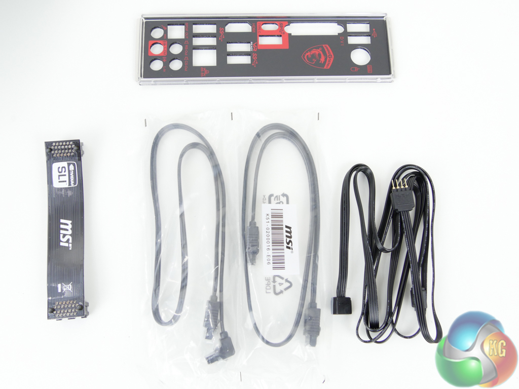 The bundle consists of a measly two SATA cables, a black SLI ribbon (not a HB bridge), the rear IO shield, and a RGB header extension and splitter cable. The RGB cable is a good addition as it allows two 4-pin headers to be connected to the motherboard and routed a long distance from the header location.