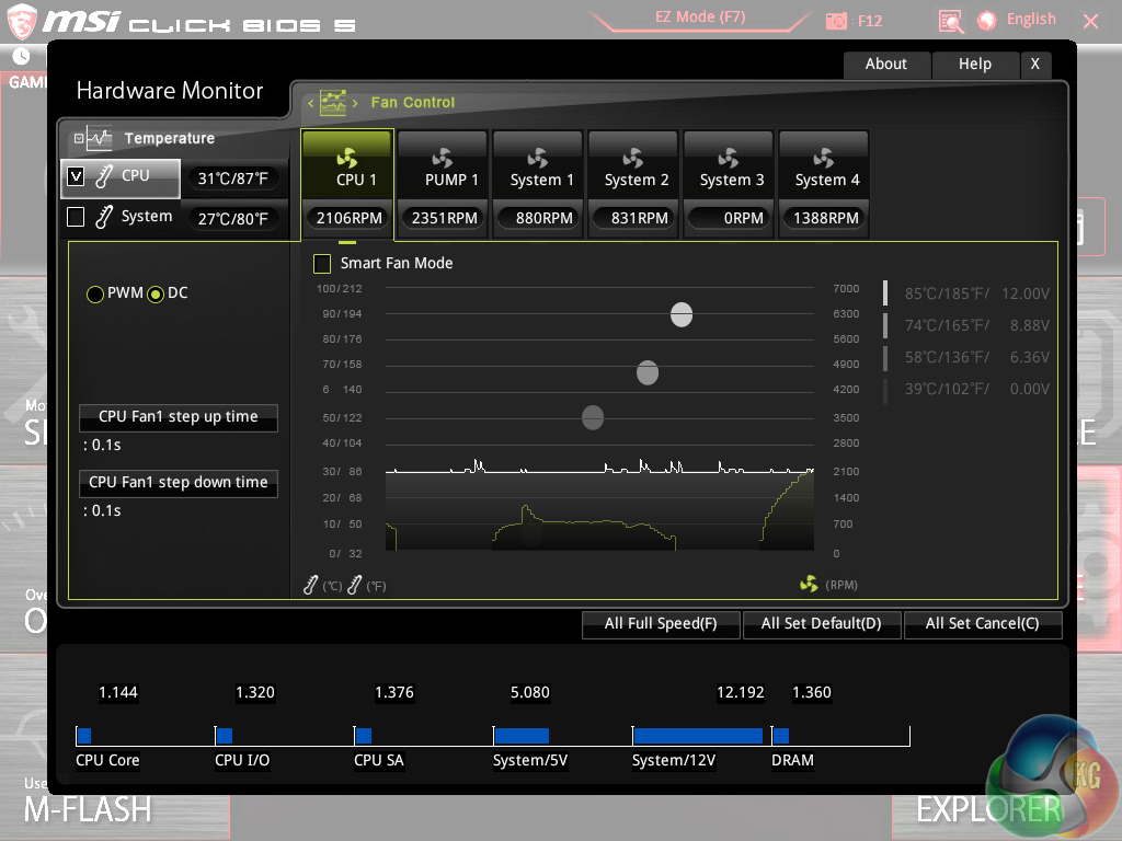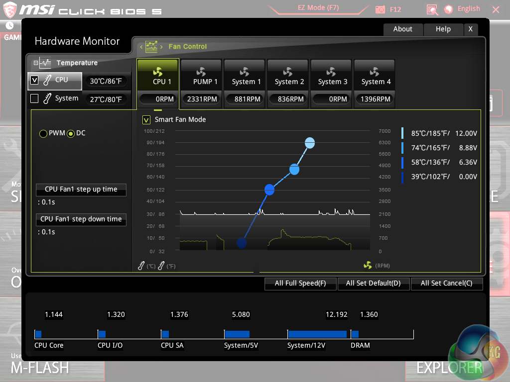 Hardware Monitor is where the primary fan control actions take place. PWM and DC control modes are selectable (only the 2 CPU headers support PWM). MSI keeps in-built fan speed presets to a bare minimum and instead relies on its good graphical control method.