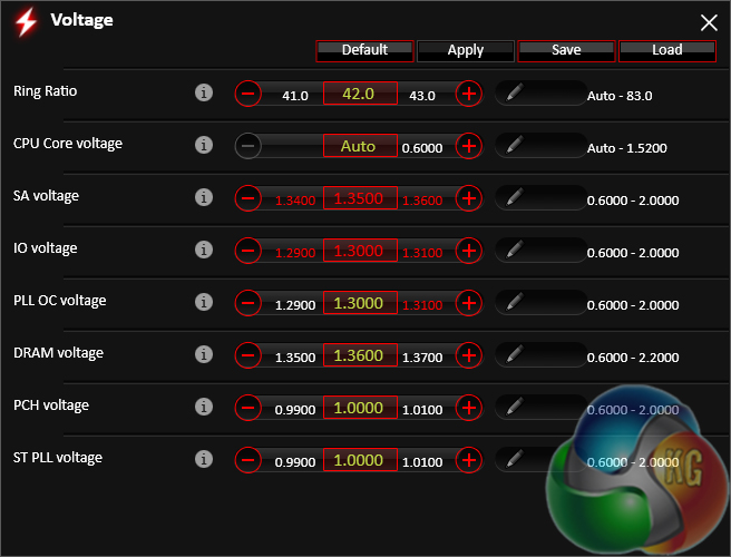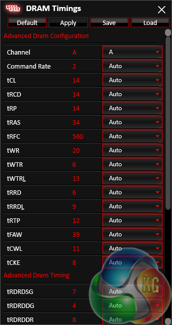 Break-out tabs display information and adjustment options for voltages, ratios, and fan speeds. DRAM timings also get their own break-out page.