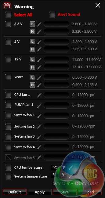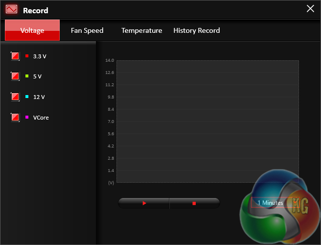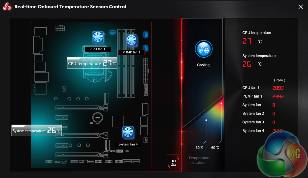 MSI's temperature sensor page is good although the number of reading points is limited to just two – the CPU and system. This page also shows which fans are connected and a temperature illustration can be set to give visual interpretation of system behaviour.