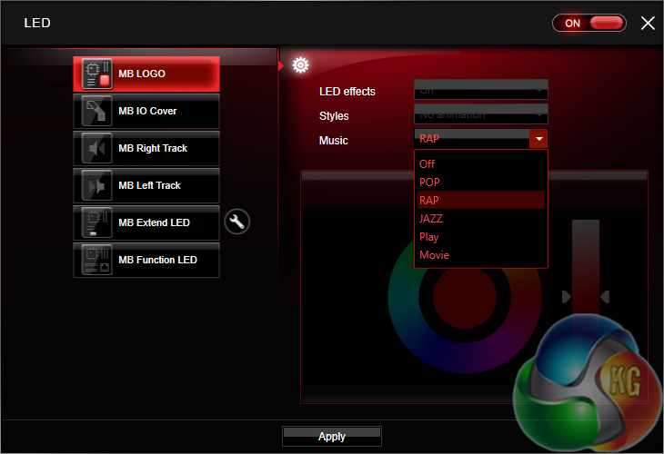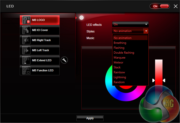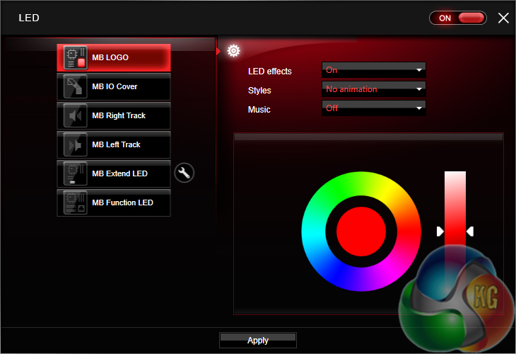 The RGB section of MSI's Gaming App is where most users are likely to be spending their time. Individual control is given to all four different lighting sections of the motherboard, the 4-pin RGB header, and the motherboard function LEDs (albeit in limited capacity).
