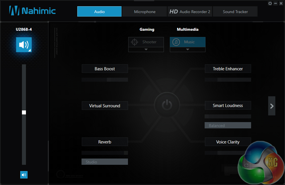 Nahimic audio software gives a user control over the operation of the board's audio system. Presets relating to gaming and multimedia content consumption can be set. There is also control for the microphone and interaction of the audio system with XSplit Gamecaster. Sound Tracker is a visual tool that can display the direction of sound sources during gaming. This is similar to Sonic Radar on competing solutions.