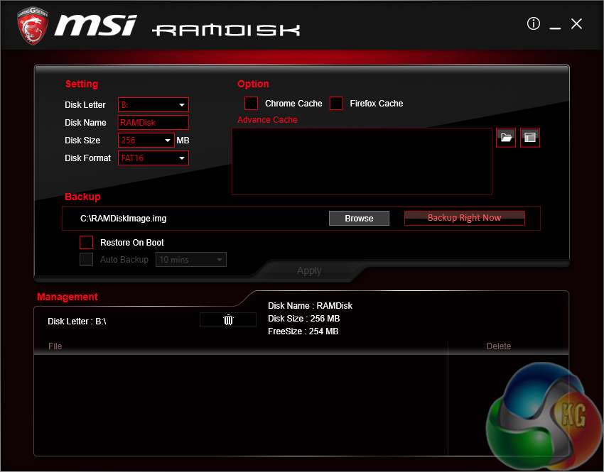 The tool also includes options to restore the RAM disk upon boot, back it up to a non-volatile storage device, and set advanced cache for certain options.