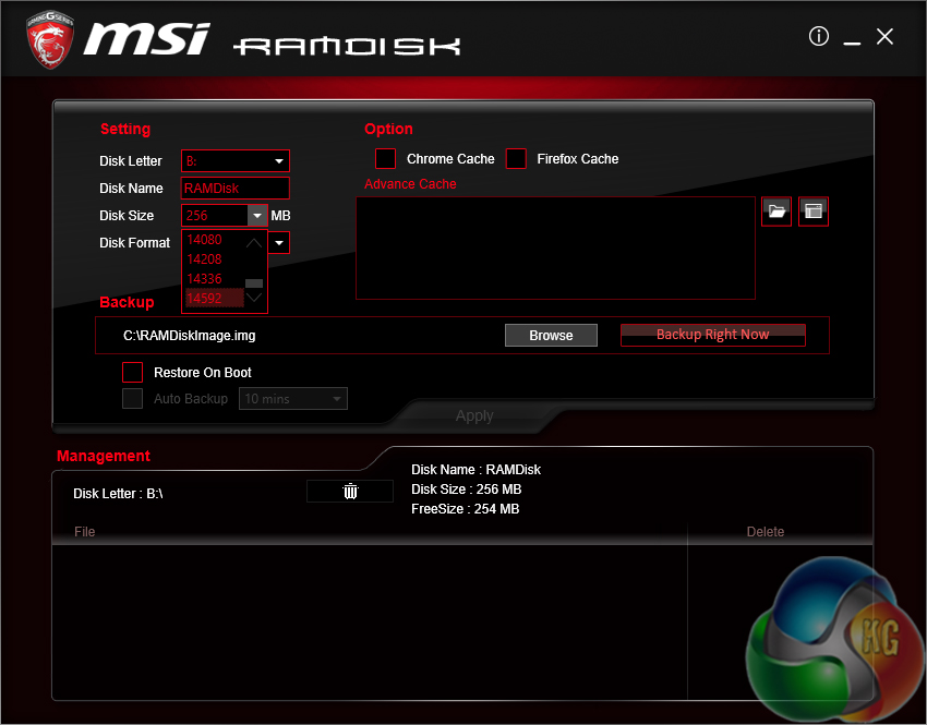 MSI's RAMdisk does what the title says. The RAM disk size can be set up to a high percentage of system memory. For example, we were able to select a 14.5GB RAM disk with our 16GB of system memory.