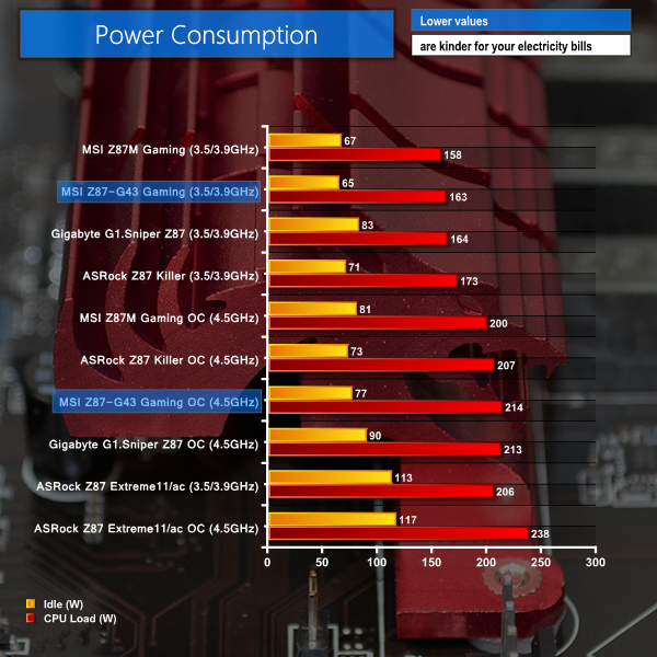 The increased difference in power draw over MSI's Z87M Gaming is likely to be related to the Z87-G43 Gaming's lower number of power delivery phases. Each of the G43 Gaming's six power phases is forced to operate at a higher current output and potentially lower efficiency level than the eight equipped with its mATX counterpart.