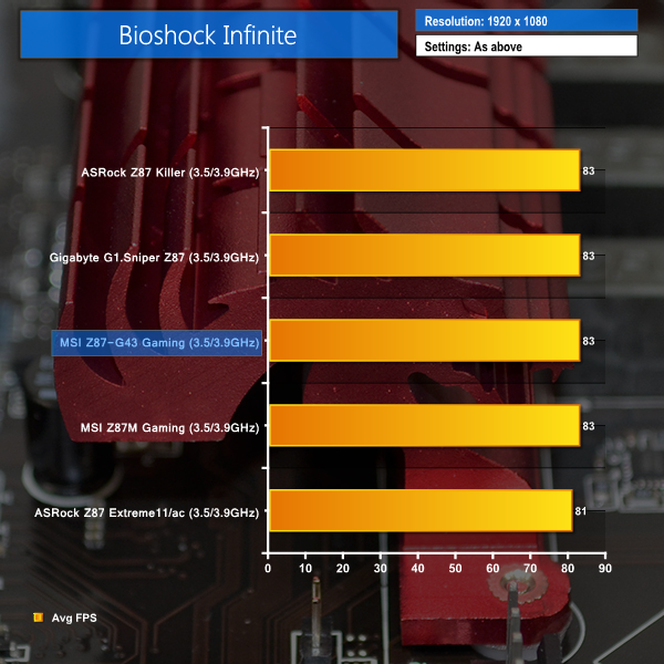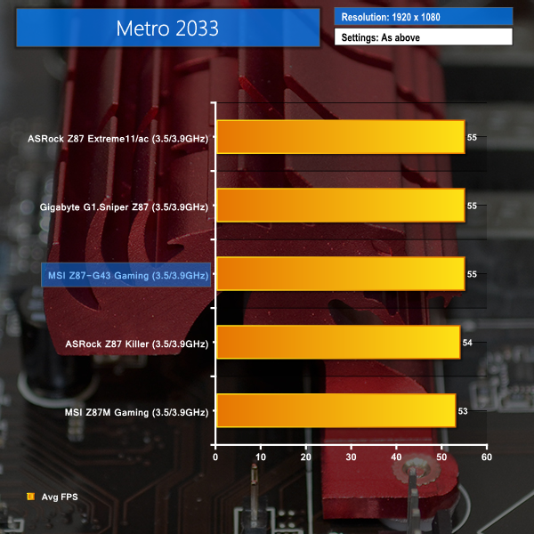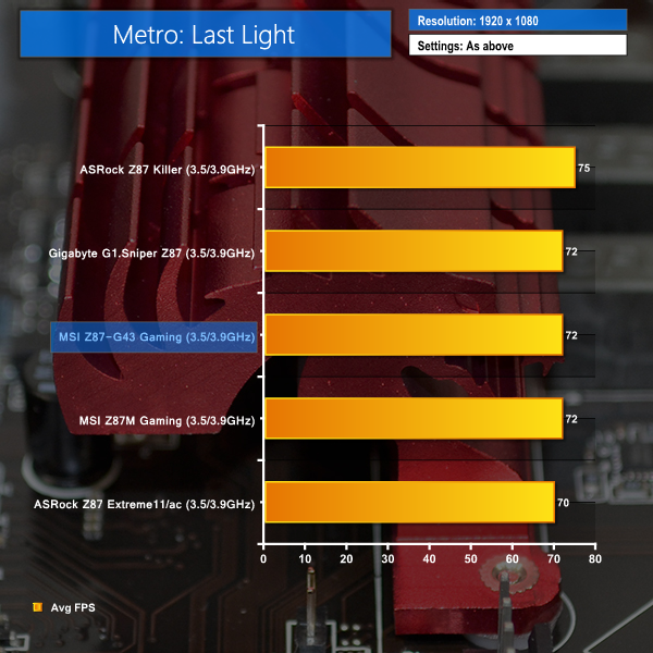 Gaming performance of MSI's budget-orientated motherboard is strong. The Z87-G43 Gaming had no problem sitting amongst our database's performance leaders in Bioshock Infinite and Metro 2033, while it also displays solid performance numbers in Metro: Last Light.