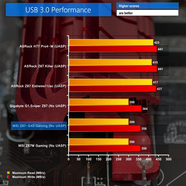 Considering its lack of a UASP-activating tool for the Windows 7 OS, it comes as no surprise that MSI's Z87-G43 Gaming sits near the bottom of the pile in our USB 3.0 speed chart.