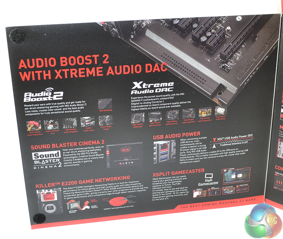 A detailed list of specifications is outlined on the rear of the box. A glimpse at the board and a hint at some of its key features are hidden behind a flap on the box.