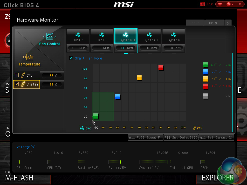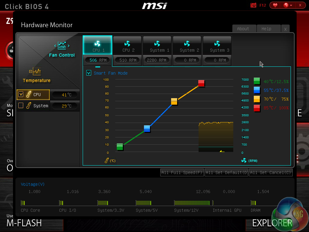 Toning down its complex monitoring section found on the Z87 series motherboards, MSI employs a fundamentally simpler means of tweaking fan speeds with the Z97 Gaming UEFI.