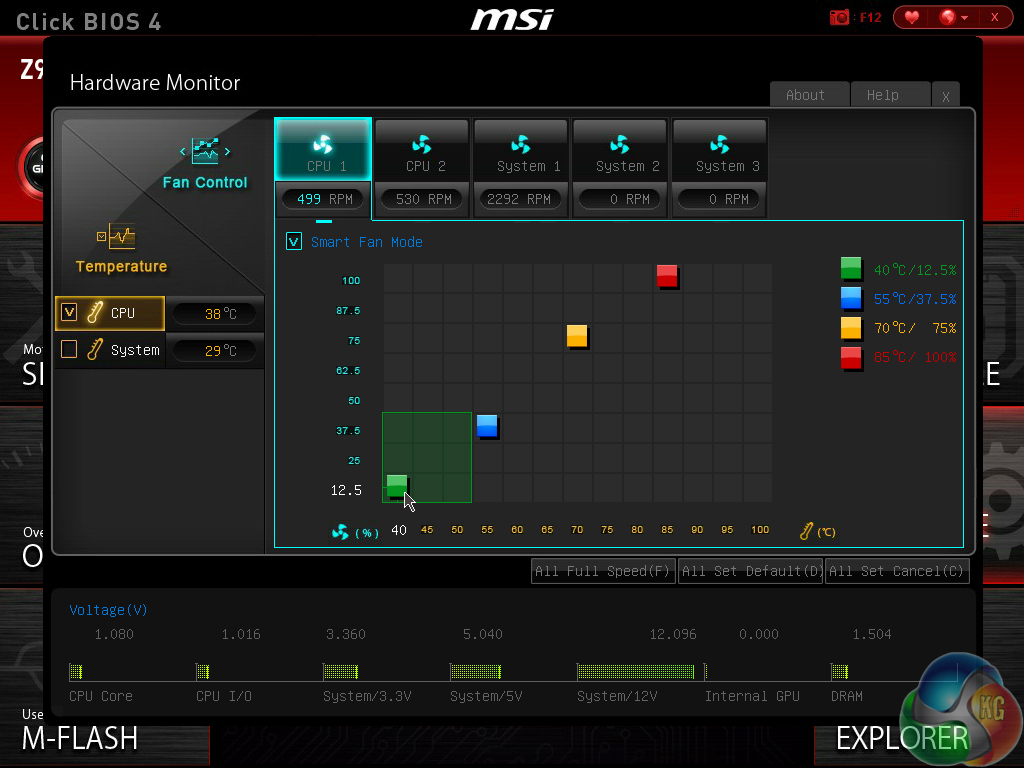 Four points on a speed against temperature curve can be adjusted to change the fan's operation. For CPU fans, the minimum point can be set as low as 12.5% speed with a 40°C lower threshold. The same flexibility is provided to system fans, although the minimum speed level is increased to 50%.