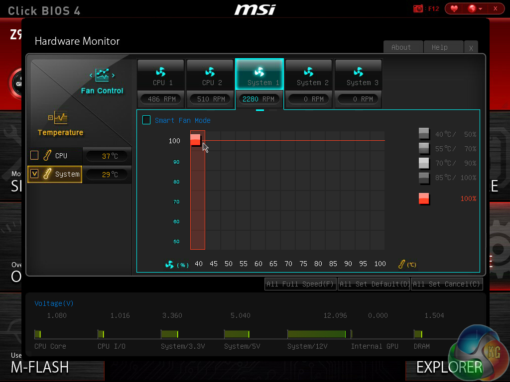 The implementation of board explorer on our current BIOS did not work well – many of the readings were incorrect and connected components were not showing up. This is something that we trust MSI to fix with future BIOS updates.