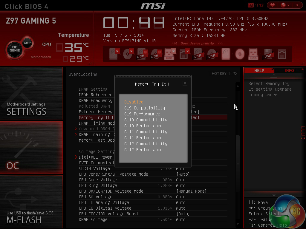 MSI includes a feature it calls ‘Memory Try It!'. The tool allows memory settings to be adjusted by the motherboard, dependent upon a user's selection. While not as heavily tweaked as customised pre-sets configured by in-house professional overclockers, Memory Try It! is arguably more valuable to the Z97 Gaming 9 AC motherboard's target audience.