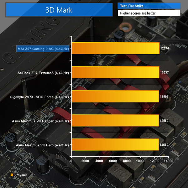 MSI's motherboard shows a particularly strong physics score in the 3DMark benchmark. Repeated testing confirms the performance advantage for MSI's board.